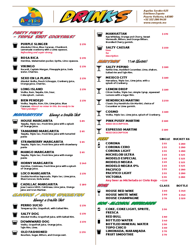 The Chicken Coop @ Awaysis Rio Bar is a bar and grill in Puerto Vallarta's Zona Romantica that combines delicious food and drinks with live music entertainment. Established in September 2022, it offers a vibrant atmosphere for locals and tourists alike. Air Conditioned for the summer!